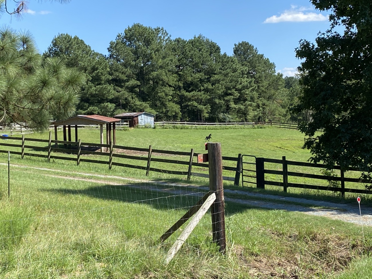13 acre farm off HWY 87 in Harnett County between Sanford and Ft. Bragg. In addition 10 acres of Bermuda hay fields, there is a 2 acre horse pasture with open and covered shelters, a riding ring coral, and a a two story barn with 5 stalls. The hay pastures were mowed for hay in 2025, but have not been maintained for week control. There are also about 4 acres of wooded fenced area suitable for goats. There is a two bedroom house available for rent. There is also a tiny house, that currently has no plumbing.